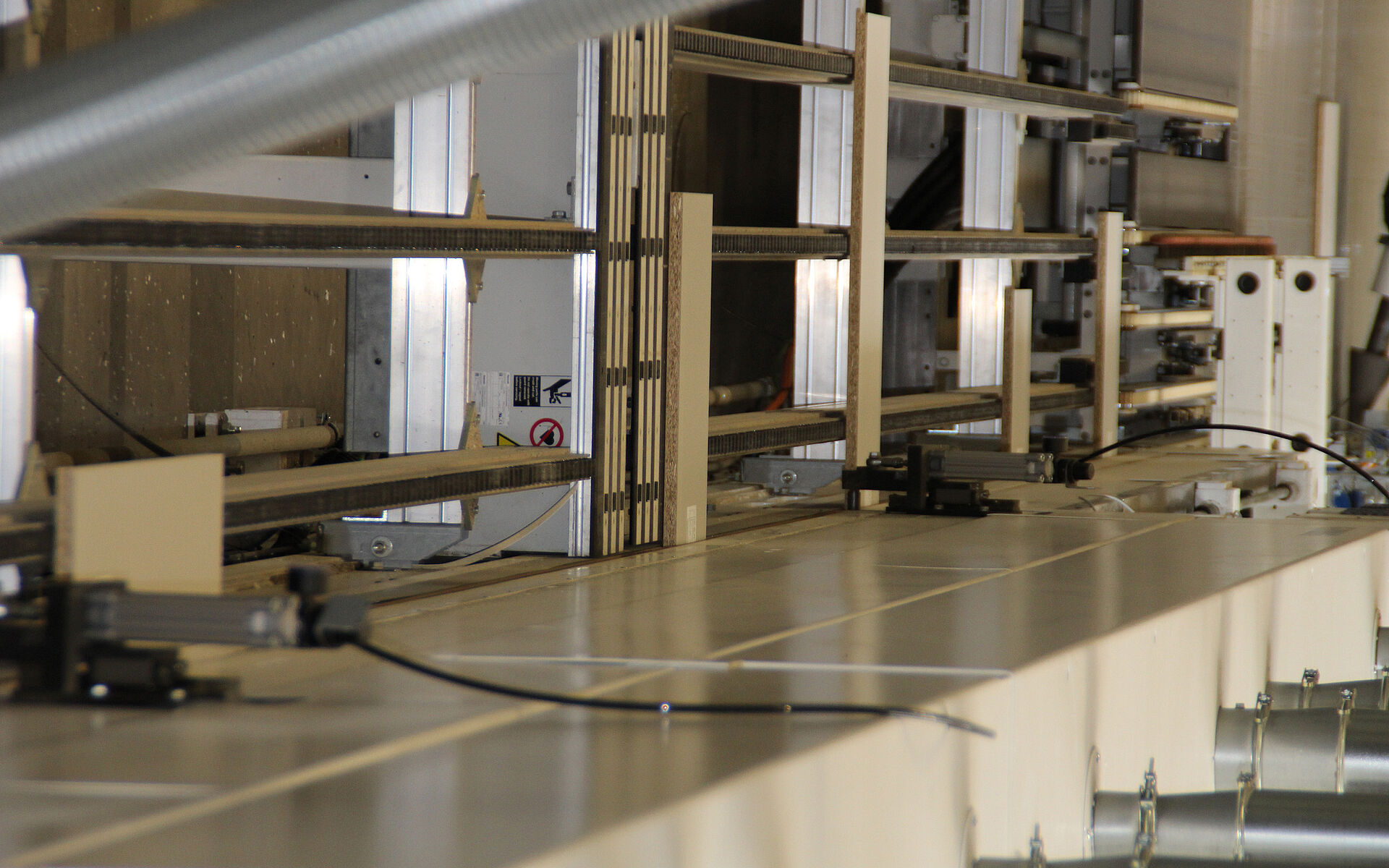 „Dadurch ist die Schnittgüte um ein Vielfaches besser. Wir haben weniger Ausbrüche bei den Oberflächen. Und auch deutlich weniger bei der Mittellage des Spanträgers“, so Vogelpohl. „Zum Vergleich: Ein gegenläufiger Füger rupft immer einen Span aus der Platte heraus. Beim Gleichlauf haben wir den gegenteiligen Effekt und der Span wird eher hineingedrückt. In Zusammenarbeit mit Leitz haben wir uns dazu Gedanken gemacht und ausprobiert, ob es auch wie gewünscht funktioniert. Dafür haben wir eine Versuchsanlage bestückt und getestet. Der Formatschnitt ist schlicht und ergreifend noch einmal sauberer gegenüber den herkömmlichen Werkzeugkonzepten.“
